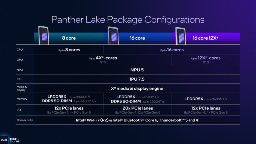 세 가지 다른 Panther Lake 구성을 비교합니다.